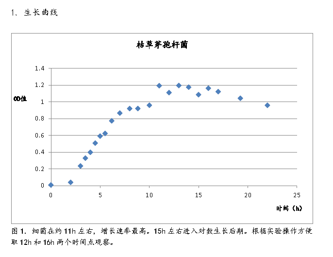 1、 將枯草芽孢桿菌在5ml NA液體培養(yǎng)基中活化,活化的菌種接種于100ml NA液體培養(yǎng)基中,37℃搖床中培養(yǎng),接種后立即取0.1ml測量OD值,后連續(xù)22h取菌液測其OD值,并繪制實驗菌株的生長曲線。