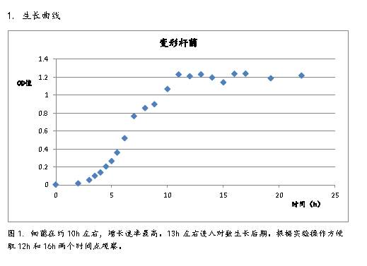 1、 將普通變形桿菌菌種在5ml NA液體培養(yǎng)基中活化,活化的菌種接種于100ml NA液體培養(yǎng)基中,37℃搖床中培養(yǎng),接種后立即取0.1ml測量OD值,后連續(xù)22h取菌液測其OD值,并繪制實(shí)驗(yàn)菌株的生長曲線。